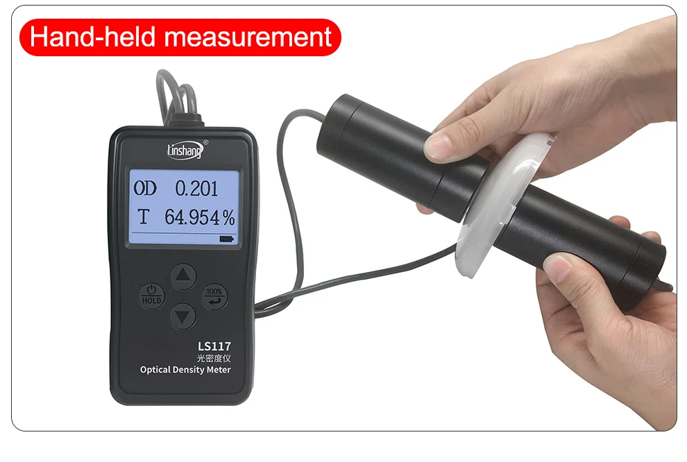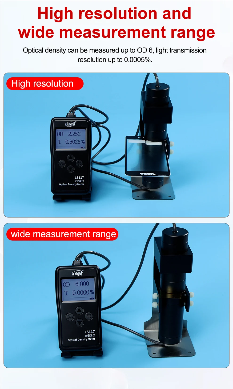 LS117 optical density meter can simultaneously measure optical density and transmittance. It utilizes the principle of diffuse transmission, making it suitable for testing the optical density of materials like aluminized film, regular film, X-ray film, lens ink, etc. Additionally, it is ideal for measuring light transmittance in opalescent semi-transparent materials and frosted matte materials. Optical density ultra-wide measuring range, optical density can be measured up to OD 6, light transmission resolution up to 0.0005%. The light source complies with the CIE bright vision standard and is guaranteed to pass the metrology institute test.